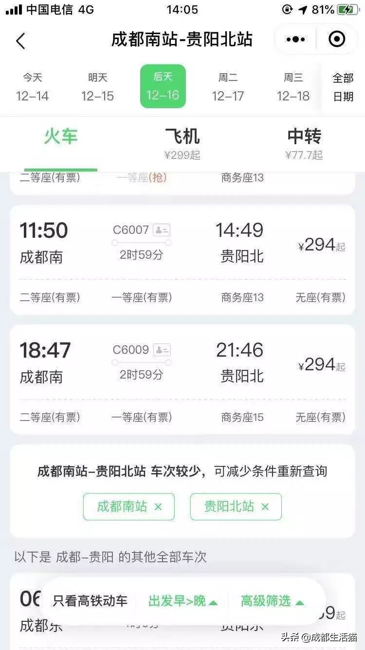 而在价格方面成贵高铁二等座票价为294元,一等座票价为470元。
