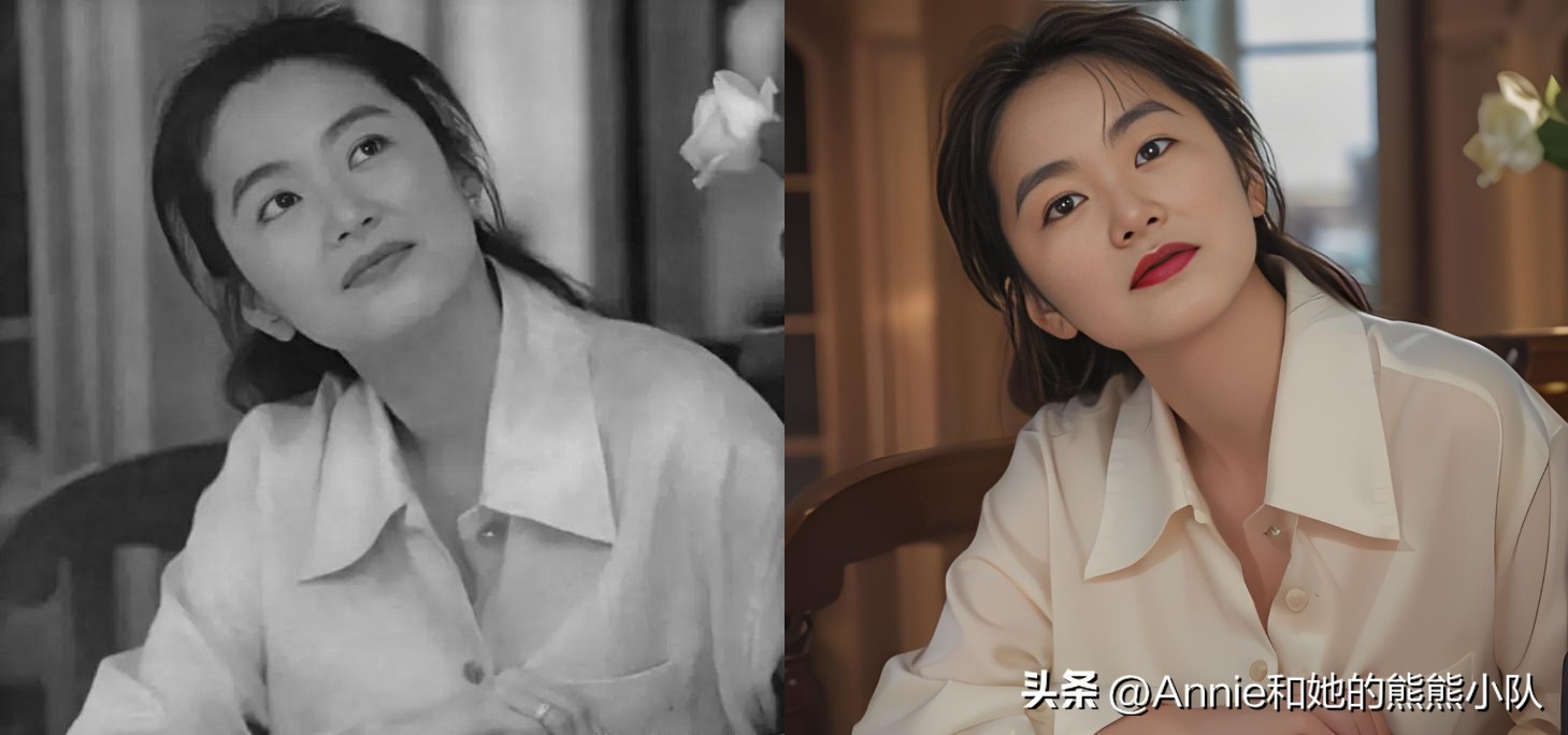 她的五官精致而和谐,每一处都恰到好处,如同大自然最得意的作品。那双明亮的大眼睛,仿佛能洞察人心,闪烁着智慧与温柔的光芒;眉宇间既有少女的纯真,也不乏日后成为影后的那份坚定与深邃。鼻梁挺拔,赋予了她面部轮廓一种不凡的立体感;唇形优美,微微一笑便能倾倒众生,既有东方的含蓄,又带着西方的奔放。