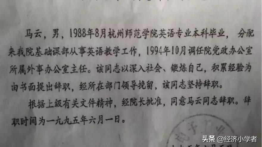 1995年,马云从杭州电子工业学院辞职,凑了2万块钱,创办了中国第一家互联网商业信息发布网站——中国黄页。 不过他也不是毅然决然就辞职了,期间也犹豫过。一天,他在回家路上遇到了系主任。系主任骑着一辆自行车,车把上挂着刚从菜市场买回来的菜。系主任叫住马云,以过来人身份,劝他好好做老师,不要冒险。马云此时突然发现,如果自己继续待下去,自己的将来就是系主任现在的样子。于是,他很快做出了决定,辞职创业。
