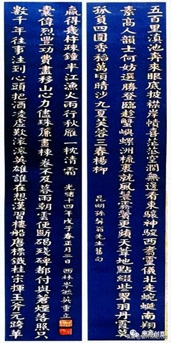 數千年往事,注到心頭,把酒凌虛⑦,嘆滾滾英雄誰在!想漢習樓船,唐標鐵柱,宋揮玉斧,元跨革囊,偉烈豐功,費盡移山心力。盡株廉畫棟⑧,卷不及暮雨朝雲⑨,便斷碣残碑,都赋予苍烟落照,只赢得几杵疏钟,半江渔火,两行秋雁,一枕清霜。(作者:孙髯)