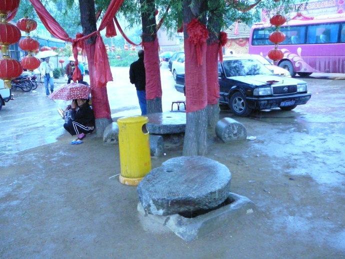 这几个景点的中间是个稍大点的广场,正中有四棵大树,树中间有一块磨盘,周围有几个平放的碾子。旁边有一处废弃的老井,上面盖着一盘残磨。这里应该是村民们平时集会玩耍的地方,戏中的很多故事正是发生在这里。