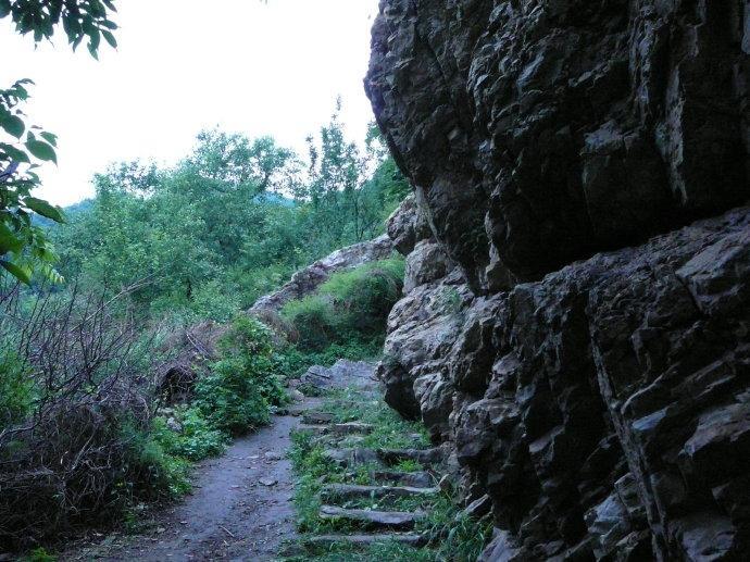 大家绕过藏君洞发现一条上山的路,来之前就听说山上的路很险,很多地方只能过一个人,而且很窄。实际爬起来还真的很费劲,很多地方的路是人工凿出来的,出奇的是凿出来的路呈一个向左倾斜的槽形。人们必须把身体向左倾,同时双手使足了劲支撑在栏杆上,不然人就倒地上了。这样走起来非常吃力,有很多人跳到栏杆外面走,这样走起来是省力了,可增大了危险性。要知道栏杆外面可是悬崖或陡坡呀!