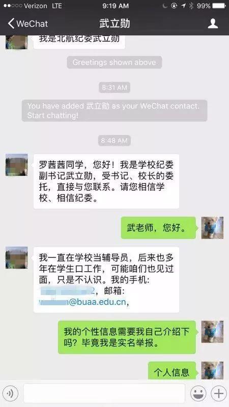 随后,在罗茜茜提供的一张微信截图上,记者看到了一位在微信上说自己是北航纪委副书记武立勋的人,与罗茜茜沟通实名举报信息的事件。