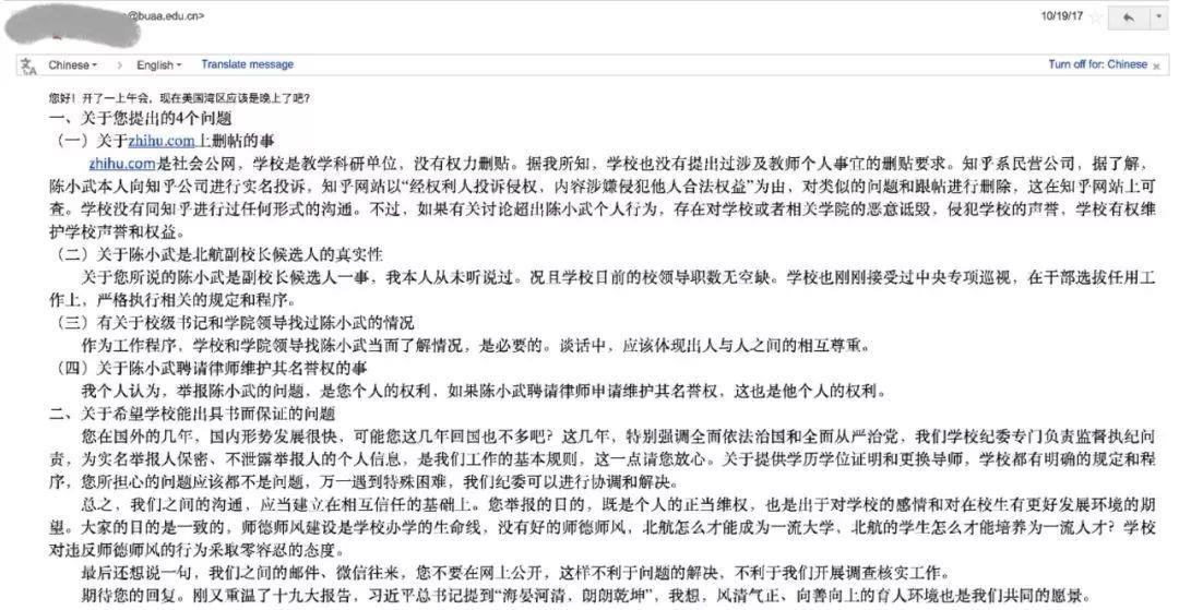 为了安抚这位女同学,罗茜茜再次向校方发邮件,在罗茜茜提供的校方回复邮件上,记者看到,校方表示,知乎上的删帖,是陈小武的个人行为,同时也否认了陈小武是副校长候选人。