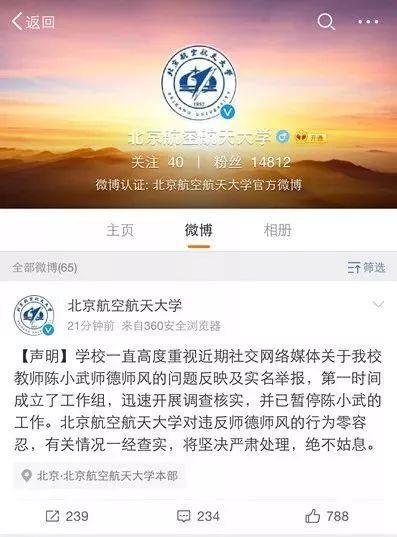 在1日晚19时左右,北京航空航天大学就网络举报一事在其官方微博上发表声明,称已在第一时间成立了工作组,迅速开展调查核实,并已暂停陈小武的工作。