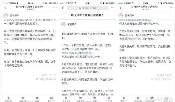 罗茜茜在那篇微博实名举报的文章里写道:“陈小武开始在知乎上大规模删帖了。”她说,“群里其中一位女生,接到了陈小武的施压电话,他在言语中透露自己是北航副校长候选人。”
