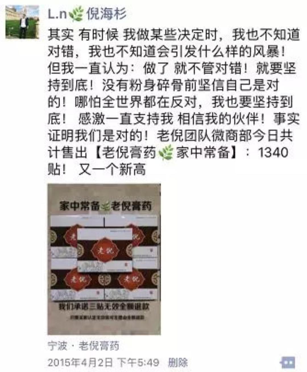 其实这段时间倪海杉和其他微信业务没什么区别。他最初的代理人来自他的熟人,其中一个是他的邻居。一开始他的代理只有两个人。第三天就卖出了第一单,当年刚开始用新模式从零开始。这给了他很大的信心。但在最初阶段,他的代理商跟随他创业,他的邻居觉得他的政策有问题,被挖走了。与淘宝相比,发展微信业务更麻烦,因为大部分都是通过自己的朋友圈和熟人做生意,所以一旦产品质量出现问题,口碑可能会大大降低。不仅如此,当时微信业务给人的感觉基本都是骗子,外界对这件事的评价普遍较低。
