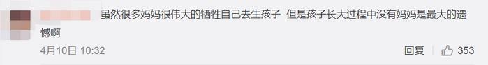 “虽然很多妈妈很伟大的牺牲自己去生孩子但是孩子长大过程中没有妈妈是最大的遗憾啊。”