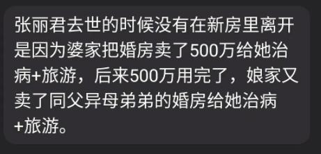 2.为了给张丽君治病+旅游,婆家把婚房卖了500万、接着又卖了同父异母弟弟的婚房。
