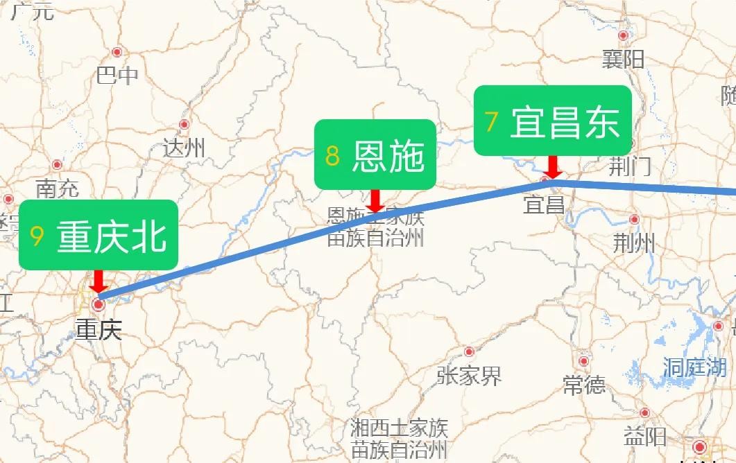 但非常有意思的事就是,从宜昌东站到重庆北站的里程为553公里,两站之间的动车组车次耗时均在四个小时以上,部分车次更是达到五个小时,这就说明宜昌至重庆这段线路的设计标准并不高,导致动车组列车的运行速度偏低。