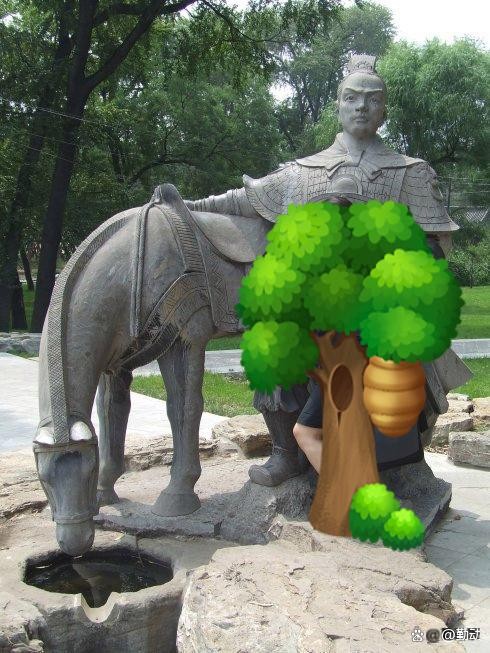饮马泉位于公园中轴线南边,修建有李世民石刻雕塑和长廊、水榭、湖水、小溪、草坪、绿树等景观。