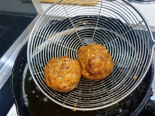 锅中烧热油,然后把肉糜团成一个个大圆球,油温7成热的时候,下锅油炸,炸至定型,表面金黄就可以捞出来了。炸的时候只是定型和上色的作用,所以里面没有熟也没关系,然后还需要经过一个步骤烹煮。