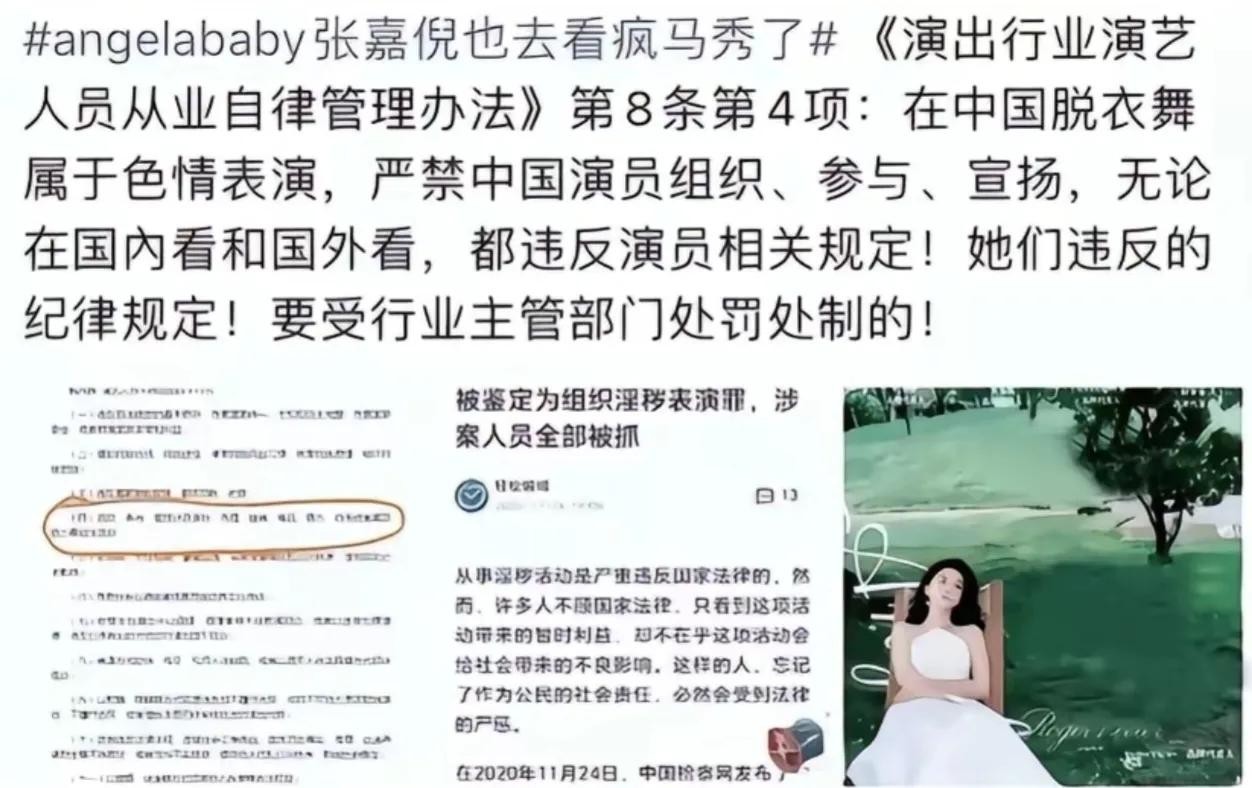 首先,让我们回顾一下事件的起因。有网友发现,在疯马秀表演中,Angela Baby被怀疑出席了表演,而白露和张嘉倪也出现在了同一现场。疯马秀表演的内容和后续的舆论反应引发了广泛关注和热议,甚至传出了两位明星被封杀的消息。这一事件迅速在社交媒体上引发了热议,公众对此表达了不同的观点和看法