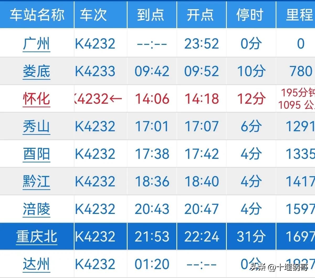 广州到达州k4232次春运临时加开列车全程1927公里,运行25小时28分钟,沿途主要停靠娄底,怀化,秀山,酉阳,黔江,涪陵,重庆北,达州。