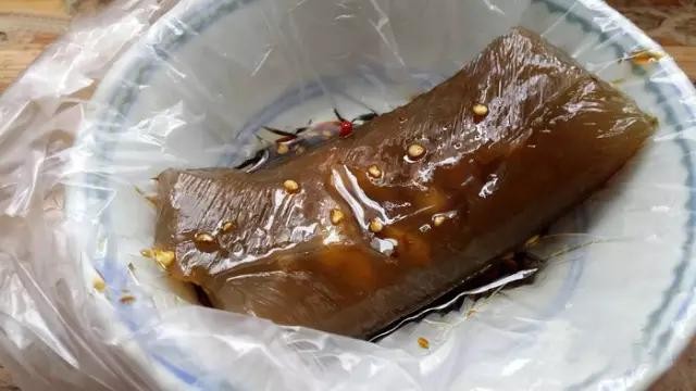 经过几个小时的蒸煮,冬叶完全吸收了红薯粉的颜色和香味,拨开外皮,里面晶莹剔透,浇上醋和辣椒油,就可以开吃了。香滑软糯,别有风味。
