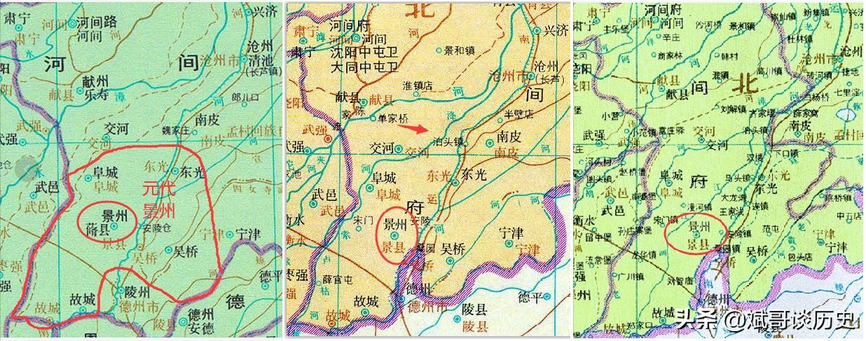 再有今天说的景州,本来治所在东光,从名字来看,也知道景州(观州)是为东光而设,也在元初移驻蓚县,也就是今天的景县。