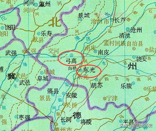 弓高城,在今天的泊头市后城子村,与阜城县前城子村交界,与东光县并不搭界,而史载弓高县并入东光县,可见东光县域在宋以后有较大的变化。