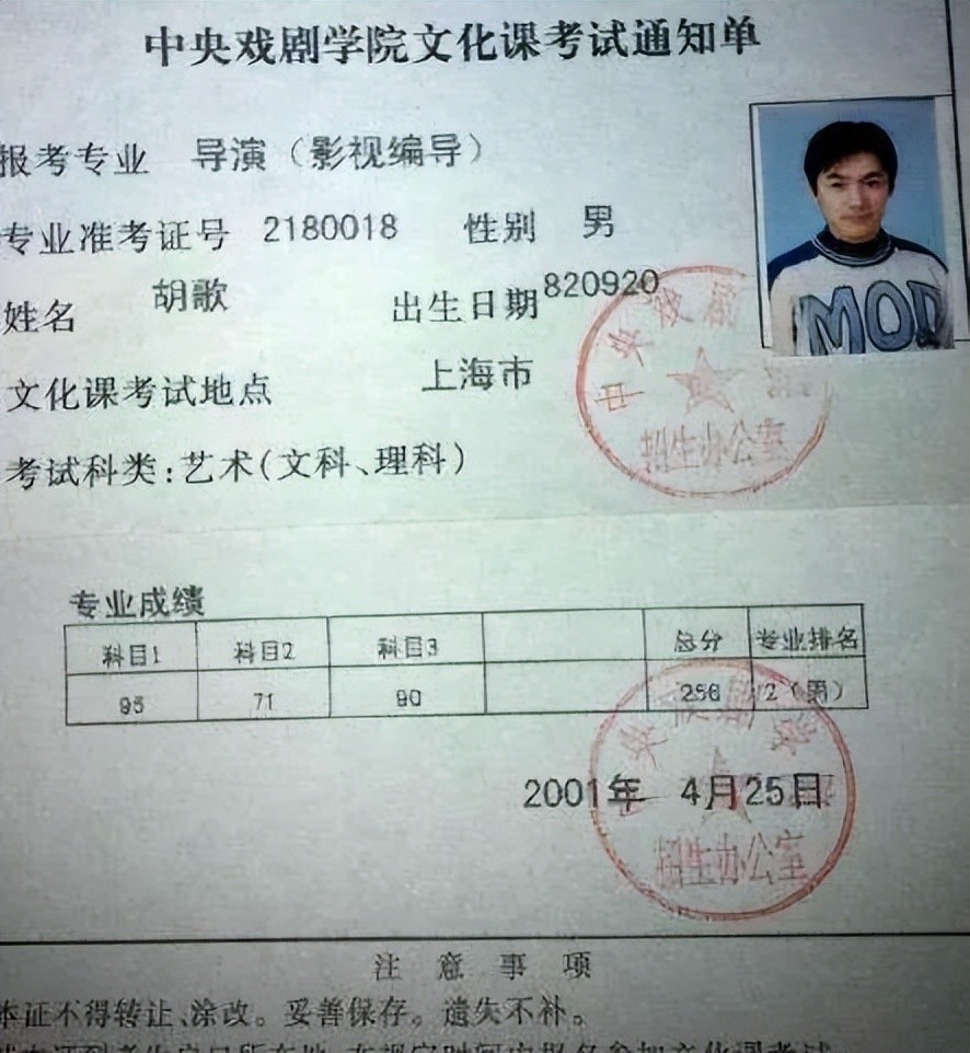 2001年,胡歌考上中央戏剧学院的导演系,