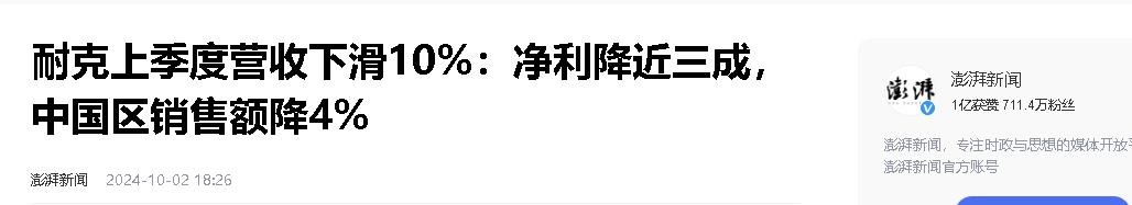 信源:澎湃新闻——耐克上季度营收下滑10%:净利降近三成,中国区销售额降4%