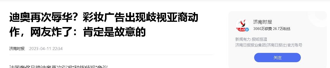 迪奥再次辱华?彩妆广告出现歧视亚裔动作,网友炸了:肯定是故意的 济南时报2023-04-11