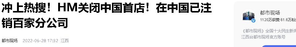 信息来源:都市现场——冲上热搜!HM关闭中国首店!在中国已注销百家分公司