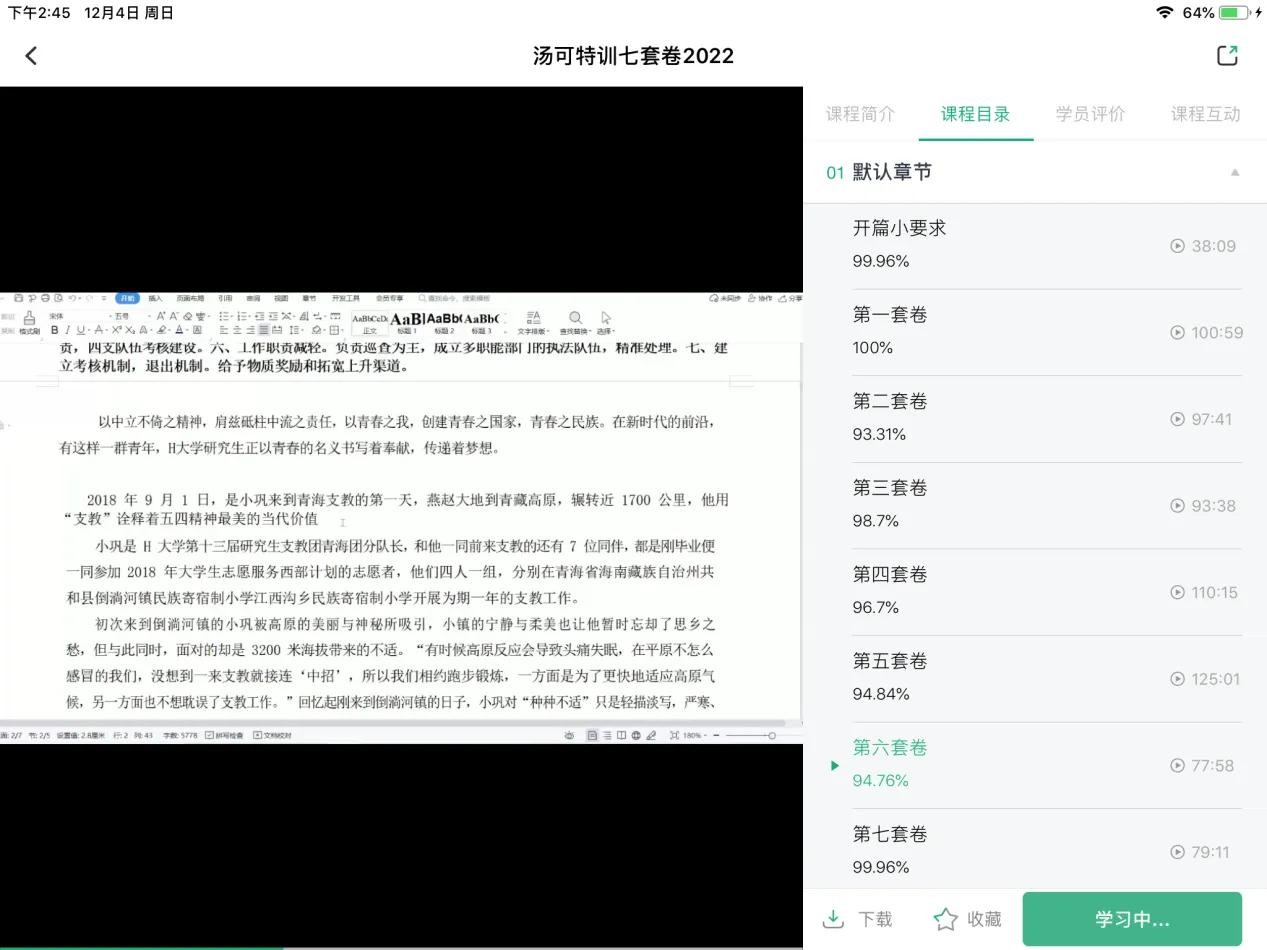 (3)大作文:大作文想拿到高分,没那么的容易,不过汤大在讲大作文的时候会从框架入手,然后再逐渐的去讲如何填充素材,如何补充细节,最后形成一篇高分作文。按照这个流程写题,我的成绩也能稳定在70+了,申论想高分,肯定还是得看汤大。