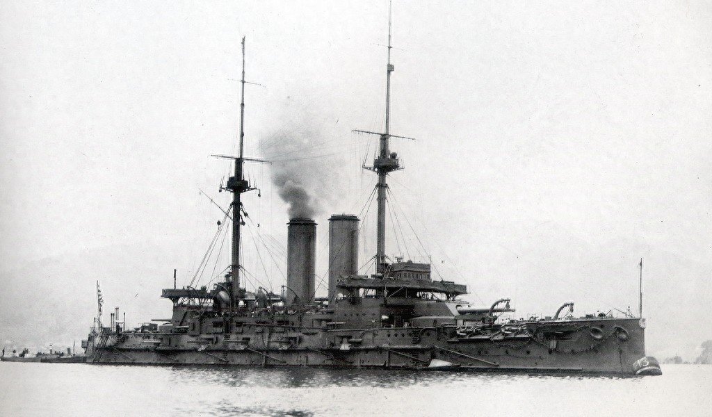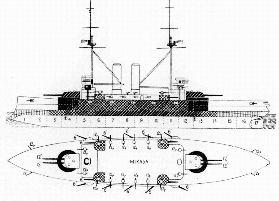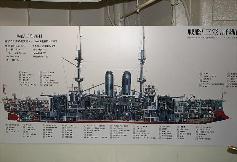 1900年11月8日三笠号下水,1902年1月15日至20日海试,3月1日在南安普顿进行交接后返回日本,5月18日抵达横须贺。该舰乘员838人,排水量15140吨,全长131.7米,宽23.2米,吃水8.28米;动力系统为2部往复式蒸汽机,输出功率15000马力,航速18节,最大载煤量1520吨,续航力9000海里/10节。