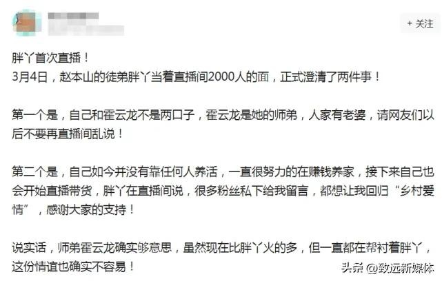 2021年春节前,服刑三年的胖丫终于出狱,刚出狱就立刻直播澄清了两件事!第一件事是澄清与二人转演员霍云龙的绯闻关系,表示两人只是师徒,霍云龙是自己收的徒弟,以及他也有妻子,希望网友们不要再谣传两人绯闻。