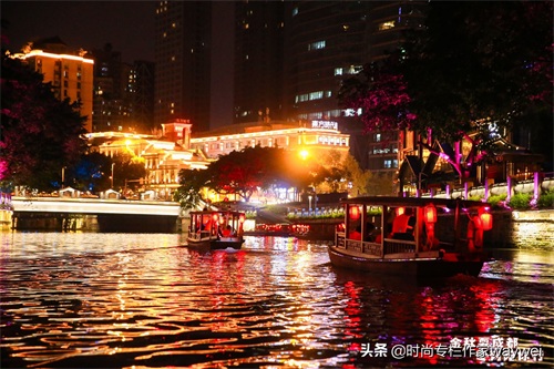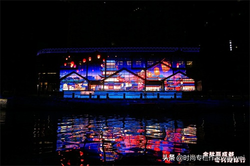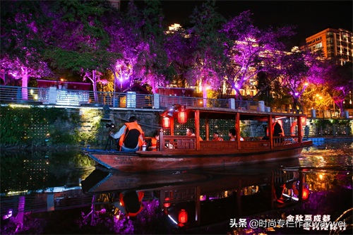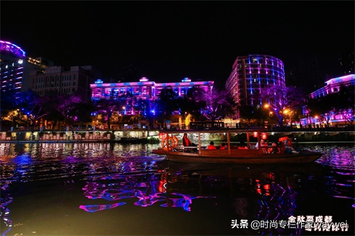 除了光影秀,江两岸流光溢彩的景色,完美地呈现成都夜色,勾勒出一幅成都生活美学画卷,坐在船上实在是一种丰富的视觉享受。