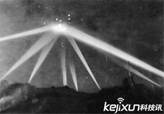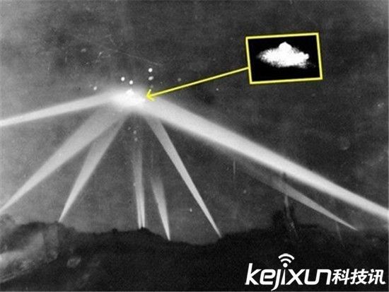 1942年2月25日,探照灯的灯光都集中在美国洛杉矶上空的一个不明飞行物上。那个明亮物体周围的亮斑,是地面部队的防空炮弹爆炸产生的碎片。