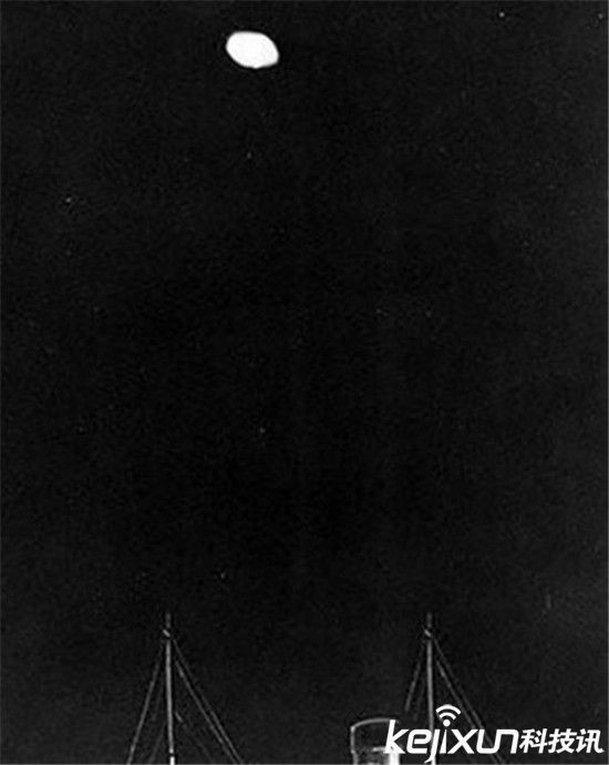 1947年,3名美国陆军航空队老兵在报告中说,他们在美国加利福尼亚州卡塔兰( Catalan)岛上空看到6个飞碟,前航空摄影师鲍勃·江表示,他成功拍摄到其中一个。在照片的最下面可以看到蒸汽船的桅杆。