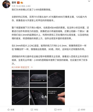 在本次发布会之前,小米官方和雷军也多次曝光了小米9的各种特性,并举办了“微博线上发布会”。同时,雷军也曝光了小米9透明尊享版的高清渲染图。