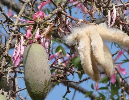 异木棉果实成熟后,厚厚的外皮自然脱落,一团白色的絮状物脱颖而出,洁白炫目,悬挂在枝头,状如成熟开裂的棉花团,这些絮状物柔软性、保暖性还胜过真正的棉花,用它还可以填充枕头。