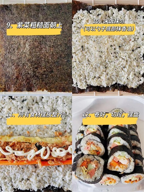 1.蒸米饭,趁热加入寿司醋(米饭:醋 按5:1) 搅拌均匀,凉凉待用。想要米饭粘一点的话就适当加点糯米。再放一些拌饭素。这样口味可以多种多样还省去了调味的麻烦。