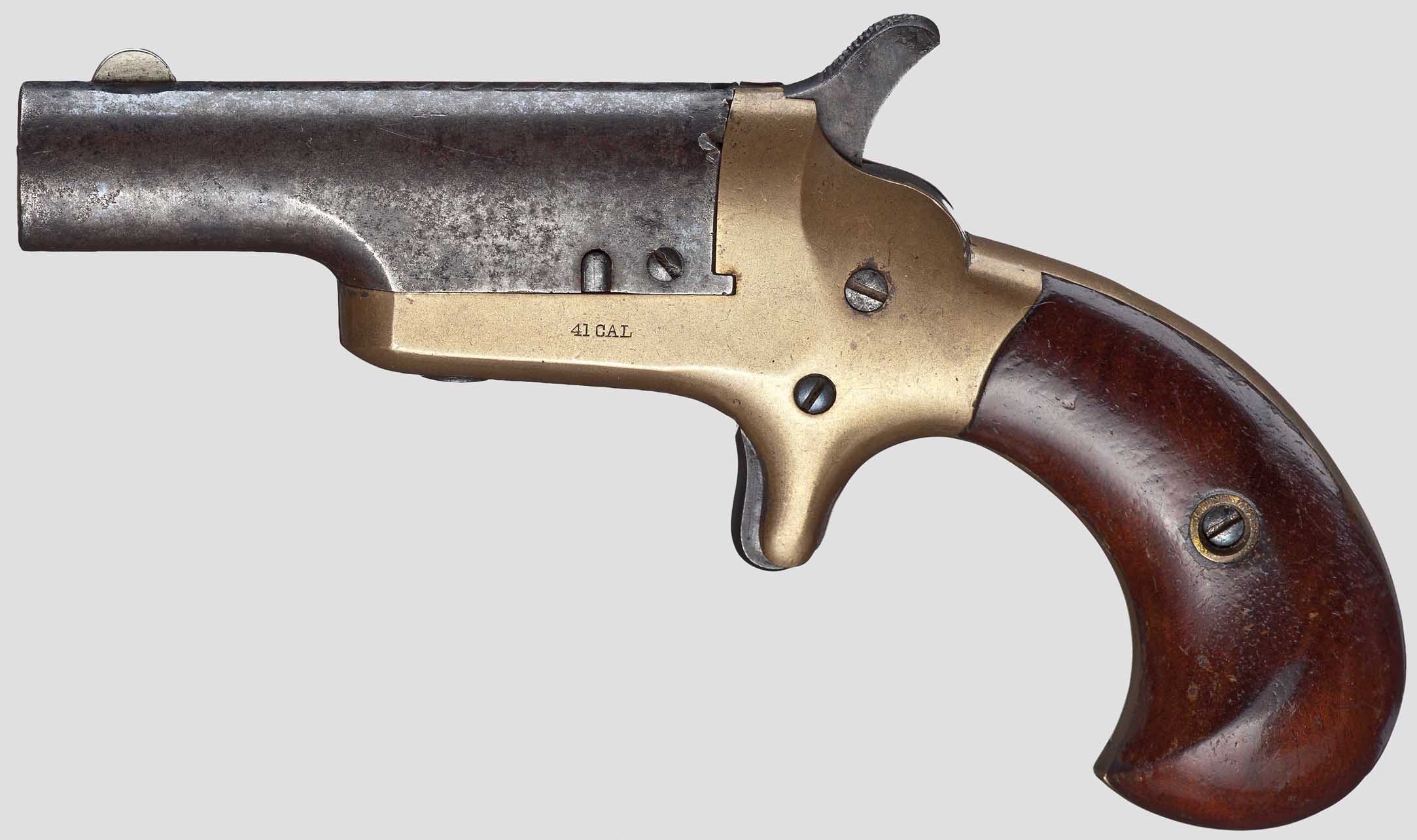 1866年雷明顿出品的双管德林杰袖珍手枪,全长仅13厘米,这种手枪已经改为后膛装填方式。