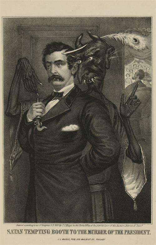 深受爱戴的总统林肯遇刺让美国民众悲愤不已,这幅版画描述魔鬼撒旦引诱布斯成为行刺总统的凶手。画面上布斯手握一支德林杰袖珍手枪。