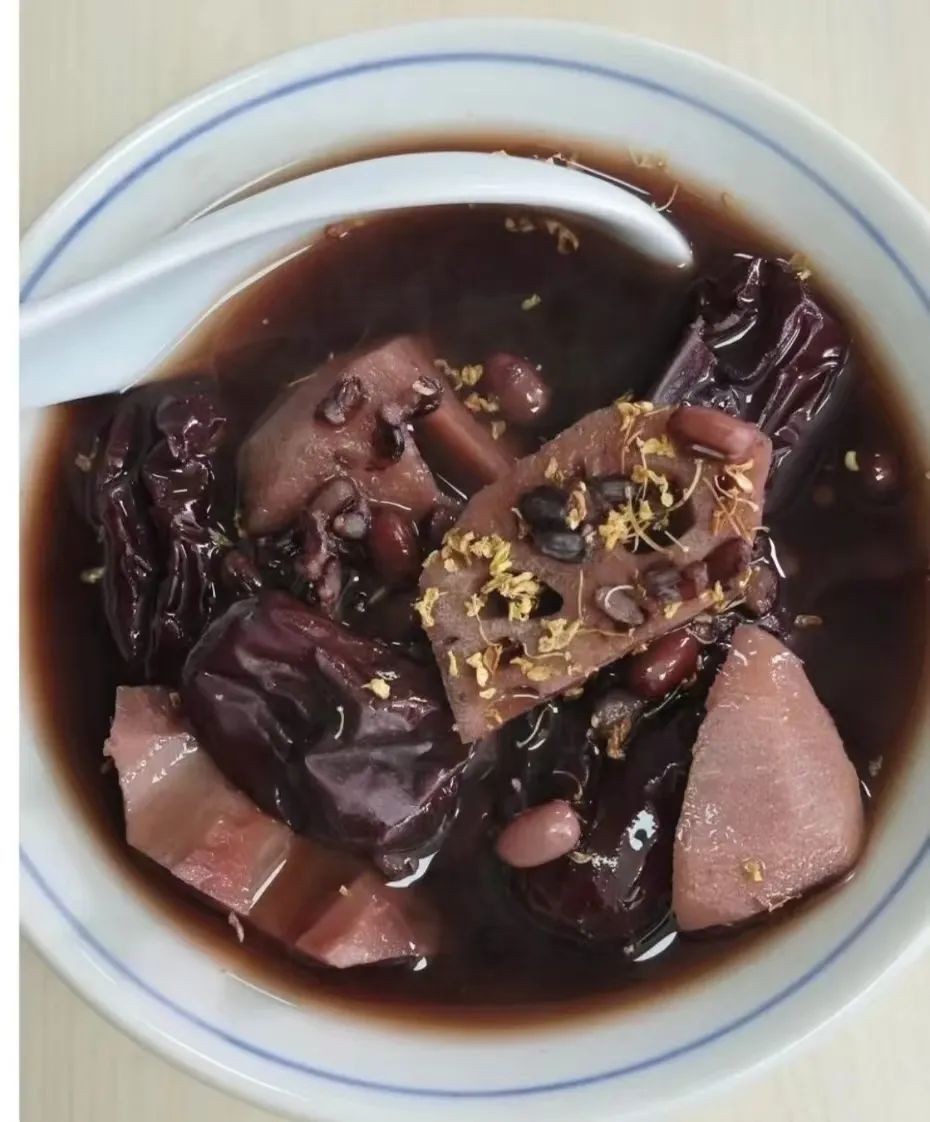 莲藕一节,黑米红豆各抓一把,红枣10颗,红糖一块,桂花少许