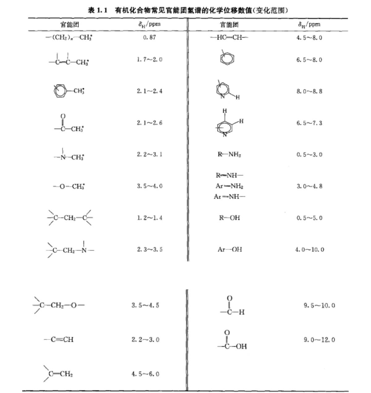 不同官能团的化学位移数值有比较大的差别。大体说来,饱和基团的δ值较小,不饱和基团的δ值较大(苯环的δ值则比烯基的δ值更大一些)。