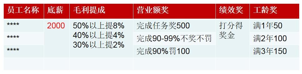 2、毛利提成:奖毛利提成点降一些,底薪升起来,基本持平。同时也不至于让员工天天想着如何卖高毛利。