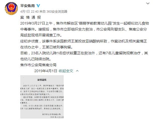 北京青年报2019年4月2日讯 4月1日晚,河南焦作市公安局焦南分局发布通报称,3月27日上午,焦作市解放区“萌萌学前教育幼儿园”发生一起疑似幼儿食物中毒事件。接报后,焦作市立即组织全力救治,市公安局刑警支队、焦南公安分局赶赴现场开展调查工作。