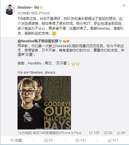 一代天骄,大MU金仙,今日转发Newbee官方微博宣布正式退役。
