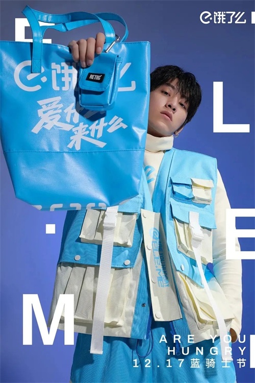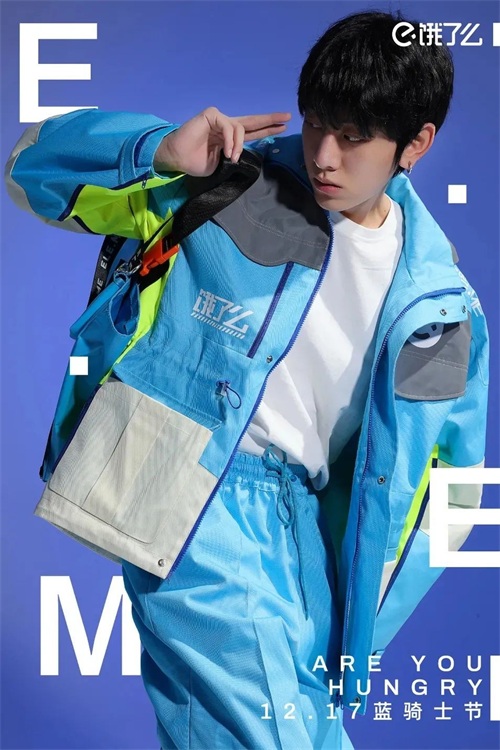 全新潮服以反光条和品牌色为基础,辅以多袋实用设计,工装专业梭织材料,结合潮流的表现手法,放大的logo主张“饿”的新态度,续写保持好奇、保持饥渴与执着、不畏冒险的饿了么骑士精神。