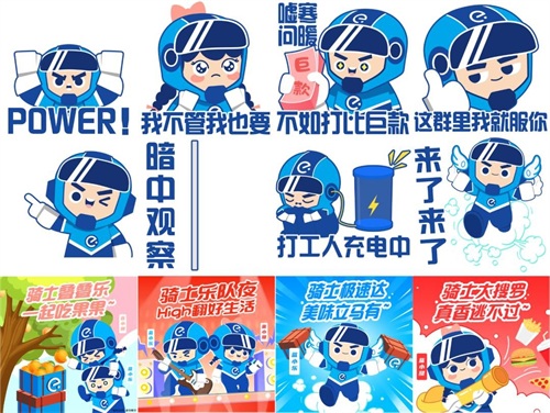 当然,形象升级不能只有潮服,不仅要让消费者有感知,更要让年轻群体更有代入感,从而让蓝骑士品牌产生实质性的进阶,于是饿了么孵化了全新蓝骑士IP——蓝小乐和蓝小甜。