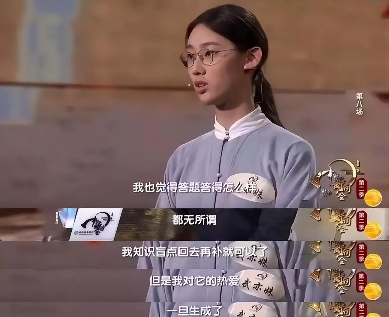 在一次飞花令比赛中,主题为"花"的一局中,她以抑扬顿挫的语调读出"何须浅碧深红色,自是花中第一流"。
