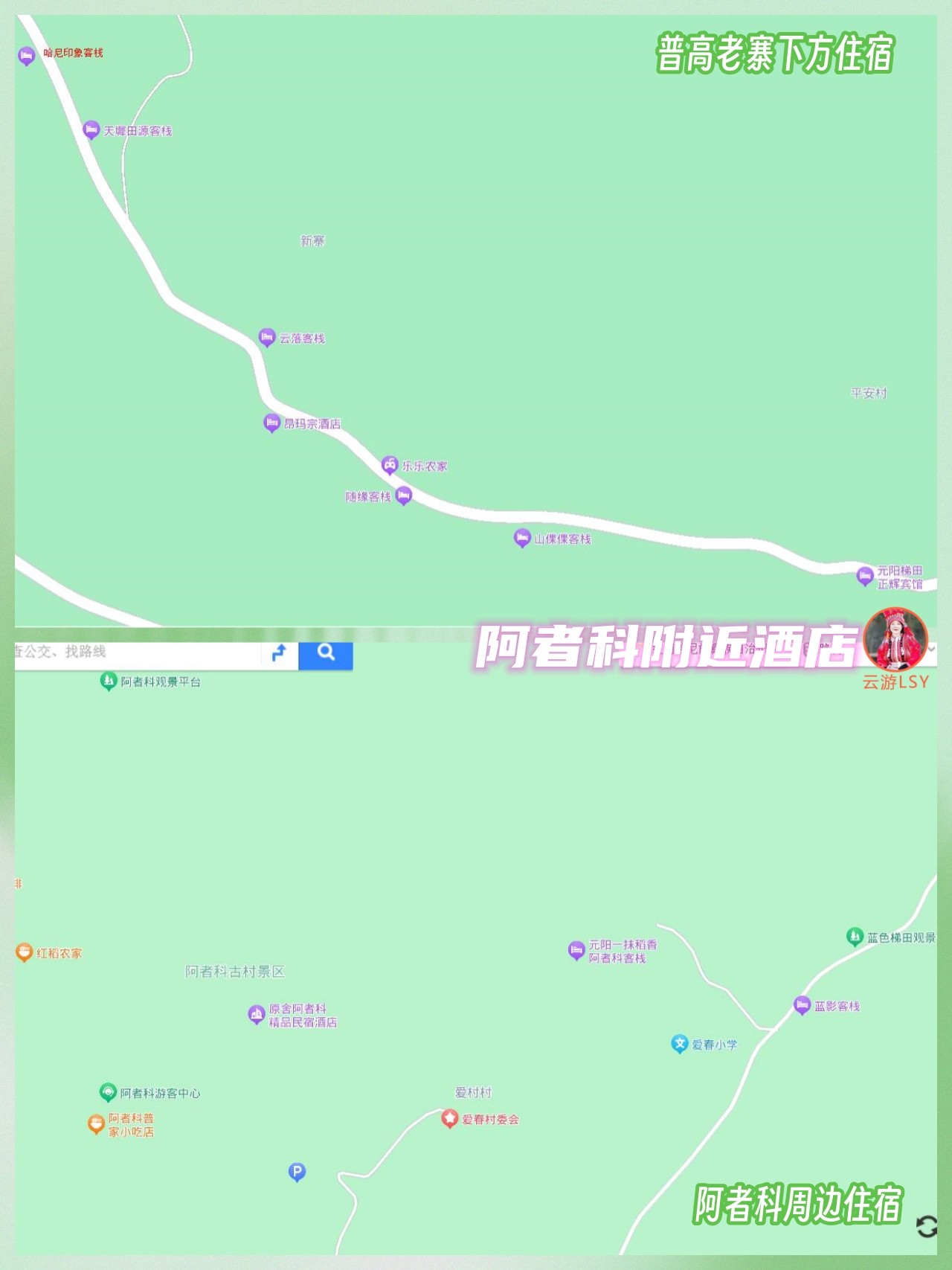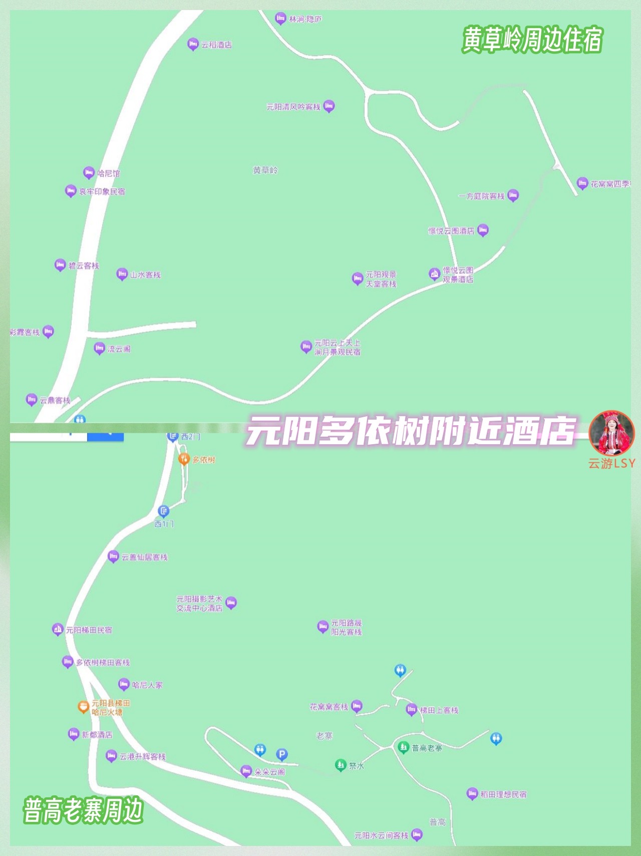 元阳梯田景区住宿,主要有五个区域:哈尼小镇、胜村、多依树上方黄草岭、多依树下方普高老寨、阿者科片区;