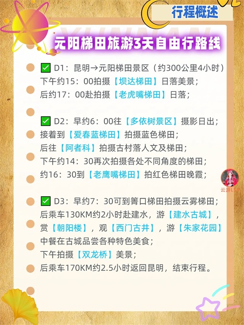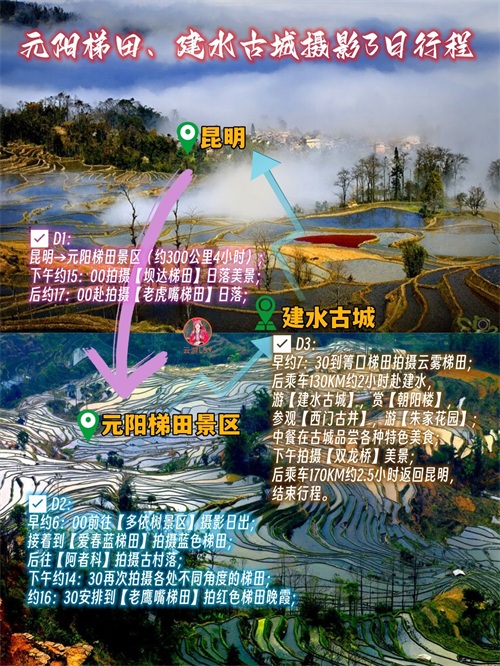 ✅ D1:昆明→元阳梯田景区(约300公里4小时);