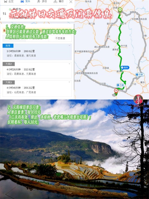 A.自驾车昆明到元阳梯田景区主要有3条线路: