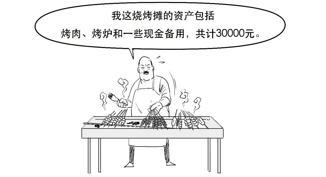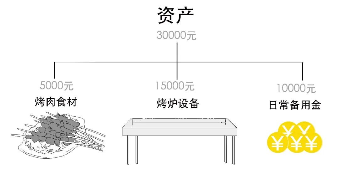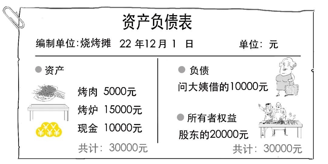 所以烧烤摊30000元资产=股东的20000元+问大姨借来的10000元。