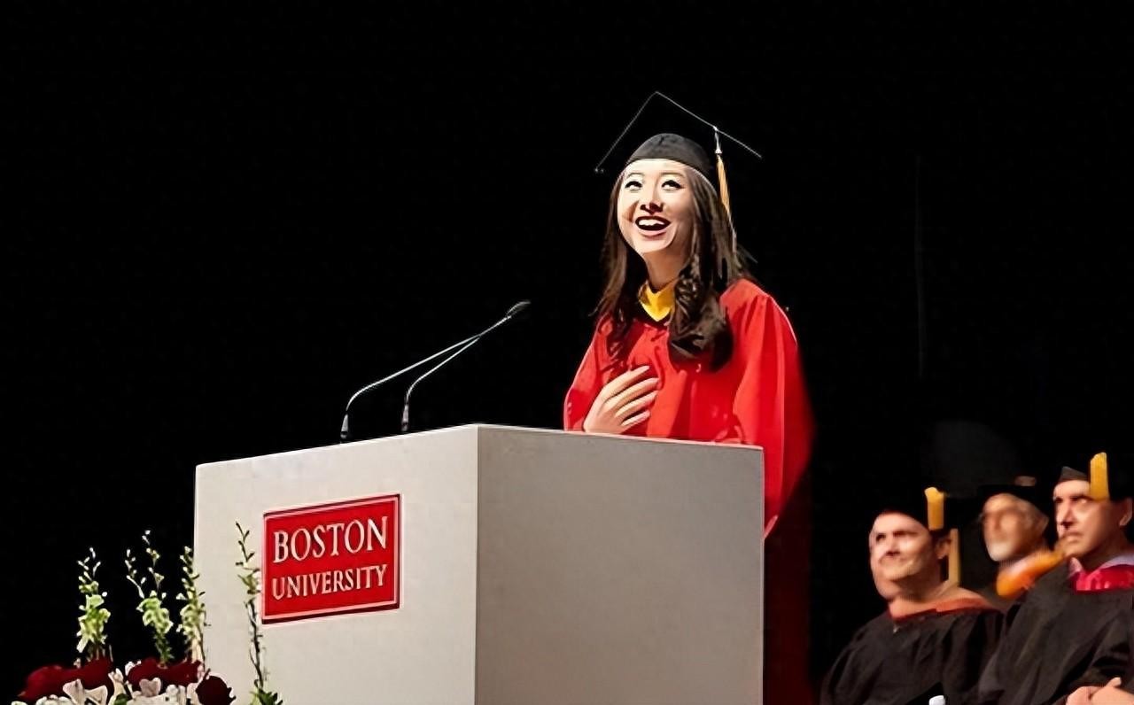 2017年美国马里兰大学的毕业演讲上,中国留学生代表杨舒平在演讲台上。