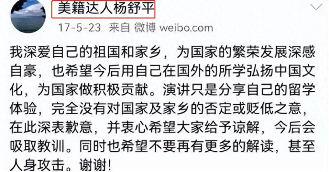 也许杨舒平以为道歉就可以稍稍降低网友的不满。